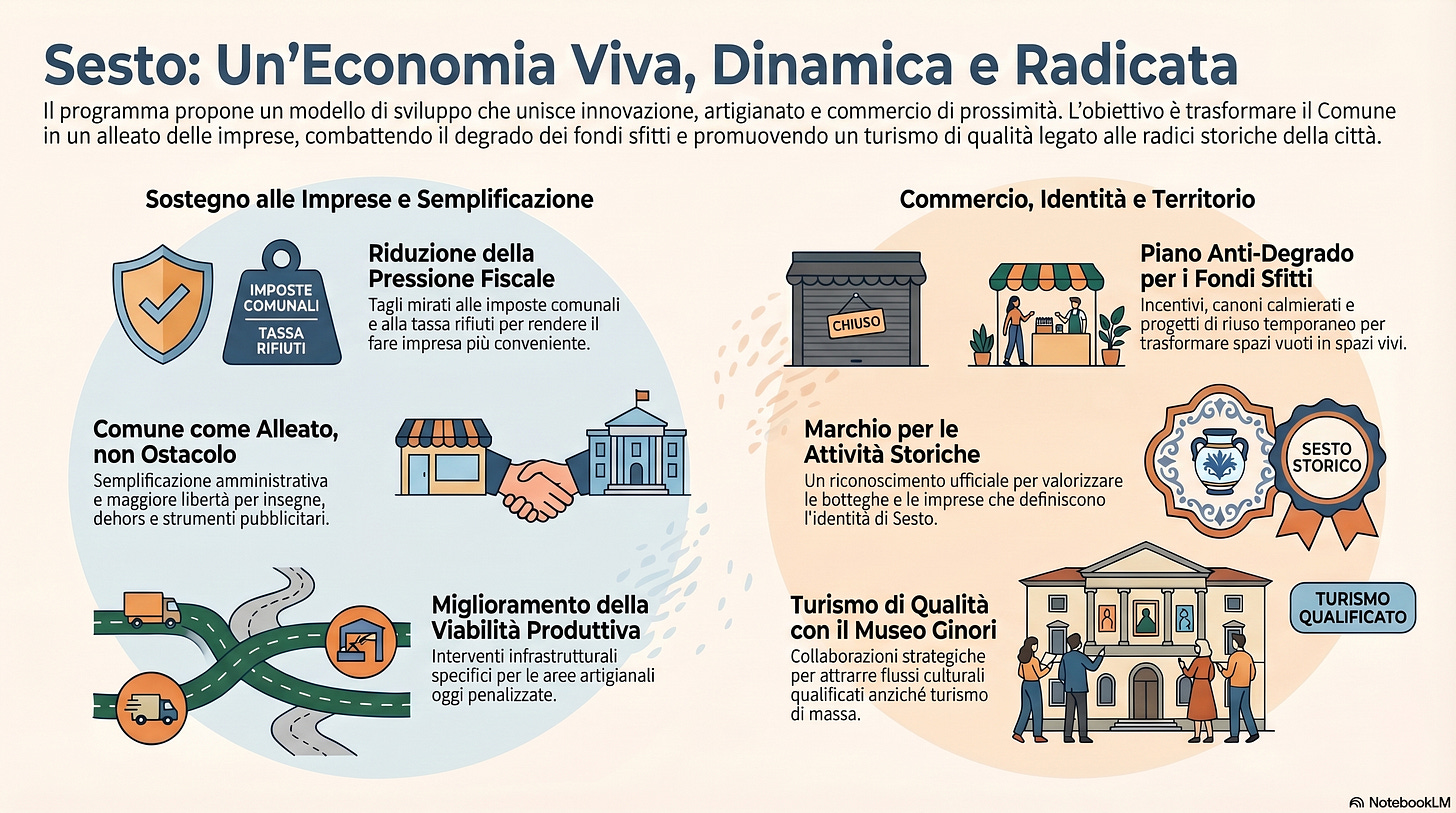 l’istituzione di un marchio comunale per le attività storiche, che riconosca e valorizzi botteghe, imprese e realtà che hanno contribuito nel tempo all’identità e alla vita economica di Sesto