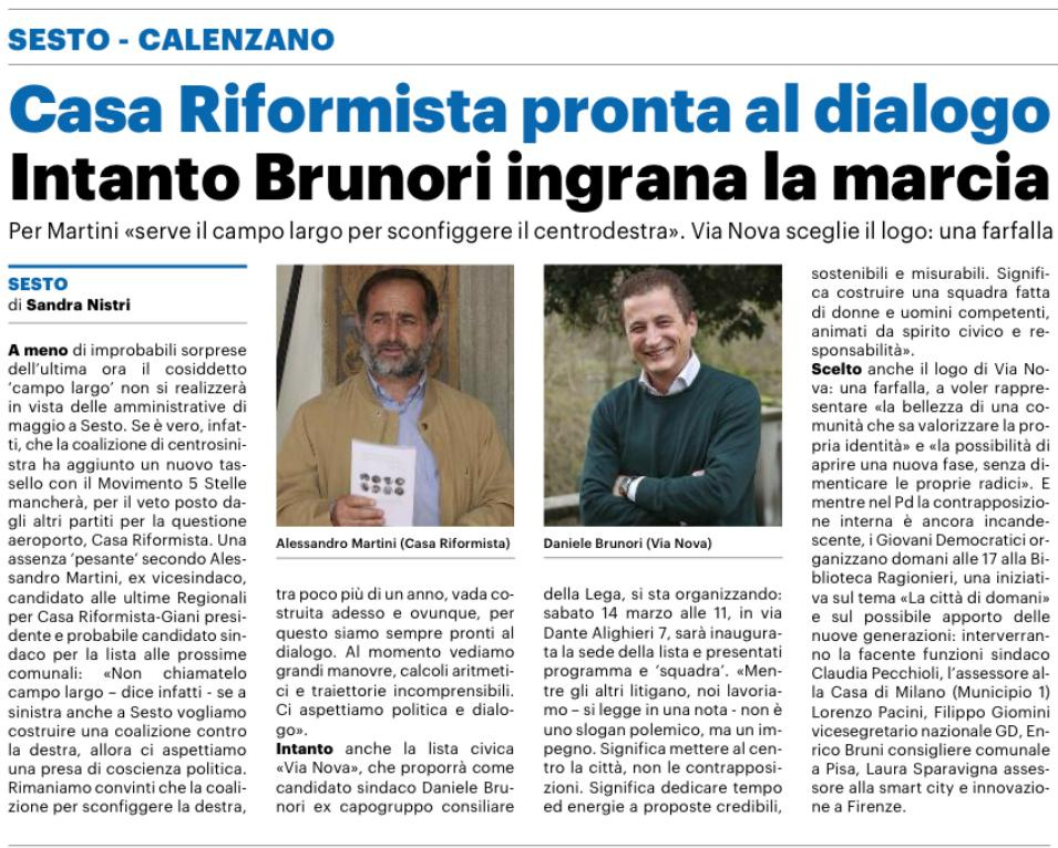 Casa Riformista pronta al dialogo. Intanto Brunori ingrana la marciaQuotidiano Nazionale, 3 marzo 2026Lista Civica VIA NOVAapr 02, 20261CondividiPrecedenteAvanti