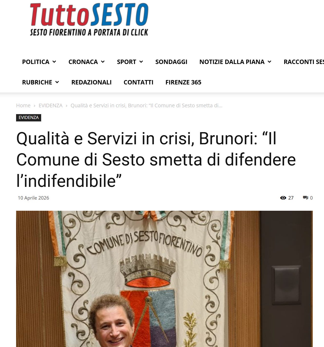 Qualità e Servizi in crisi, Brunori: "Il Comune di Sesto smetta di difendere l'indifendibileTuttoSESTO, 10 Aprile 2026Lista Civica VIA NOVAapr 10, 20261CondividiLink: https://tuttosesto.net/qualita-e-servizi-in-crisi-brunori-il-comune-di-sesto-smetta-di-difendere-lindifendibilePrecedente