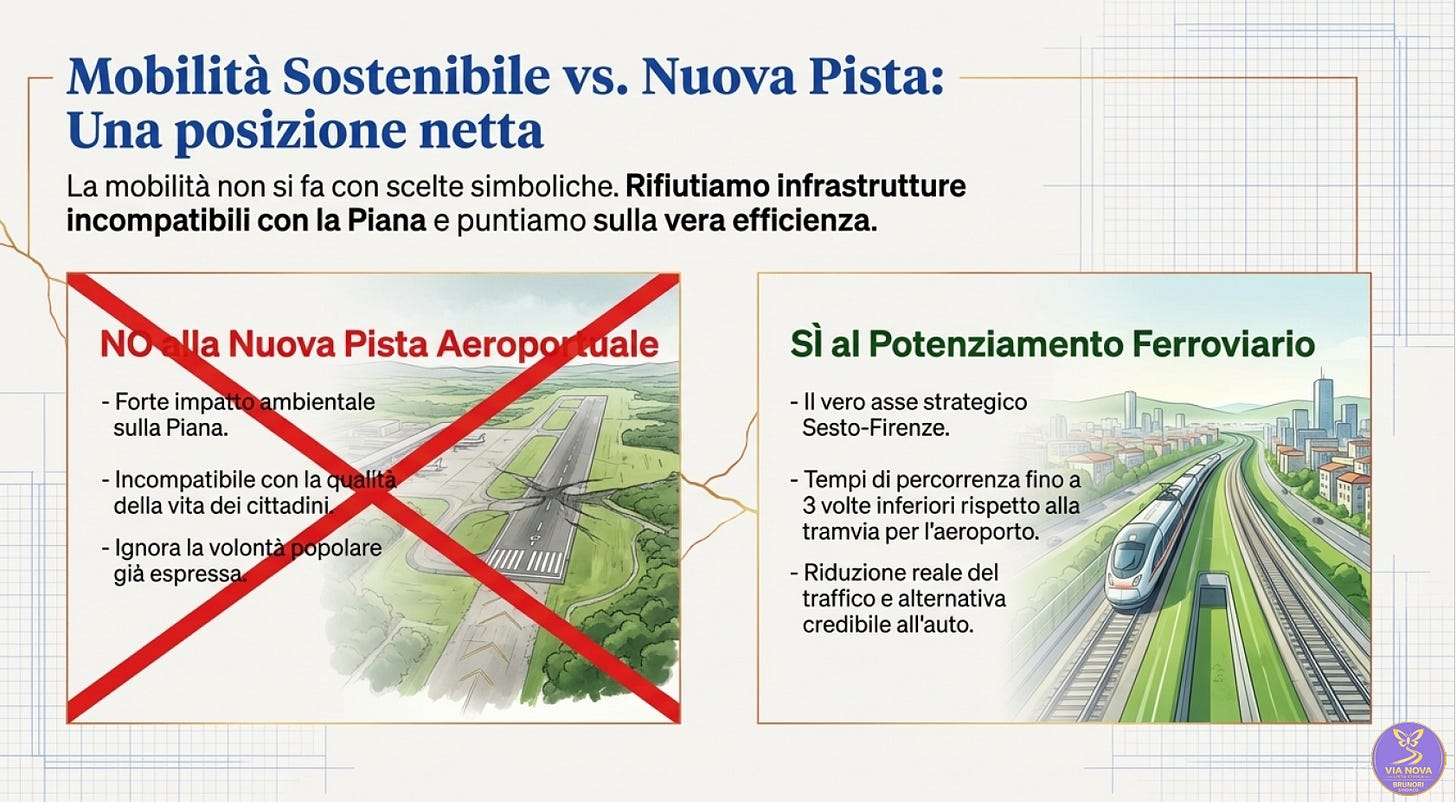 Ambiente e Mobilità: La nostra è una posizione netta: diciamo NO alla nuova pista aeroportuale per difendere il Parco della Piana, puntando invece sul potenziamento del collegamento ferroviario Sesto-Firenze.