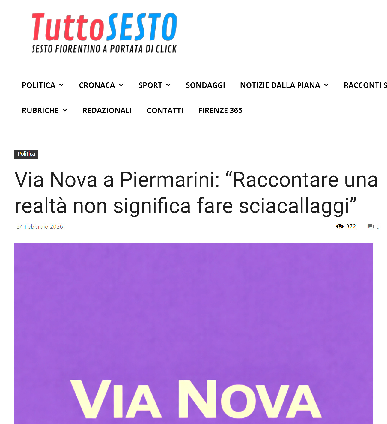 Via Nova a Piermarini: "Raccontare una realtà non significa fare sciacallaggi"TuttoSesto. 24 Febbraio 2026Lista Civica VIA NOVAapr 02, 20261CondividiLink: https://tuttosesto.net/via-nova-replica-a-piermarini-raccontare-una-realta-non-significa-fare-sciacallaggi/PrecedenteAvanti