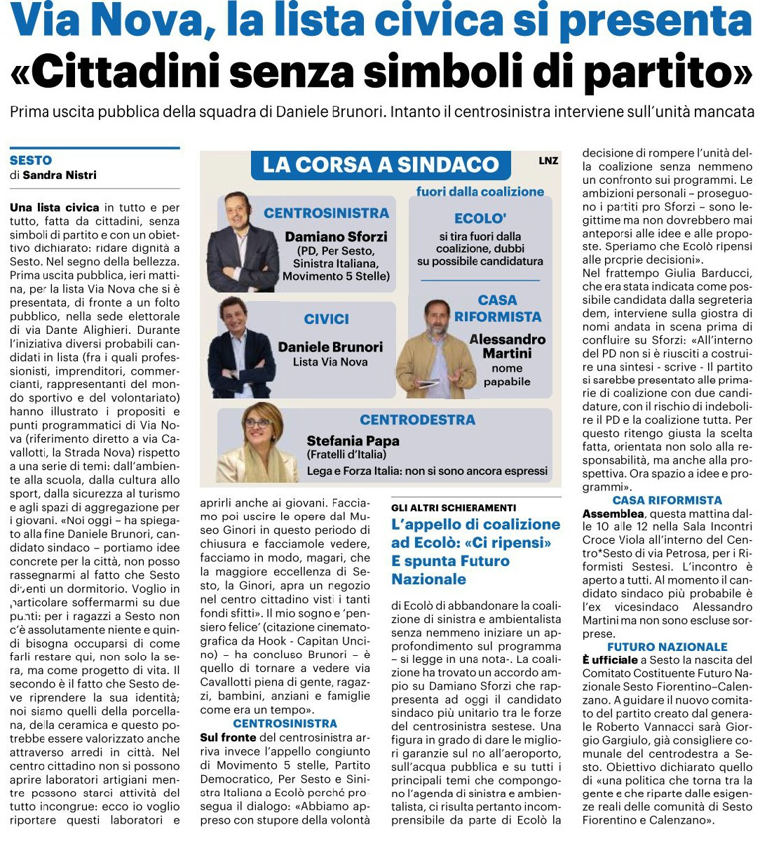 Via Nova, la lista civica si presenta. "Cittadini senza simboli di partito"Quotidiano Nazionale. 15 marzo 2026Lista Civica VIA NOVAapr 02, 20261CondividiPrecedenteAvanti